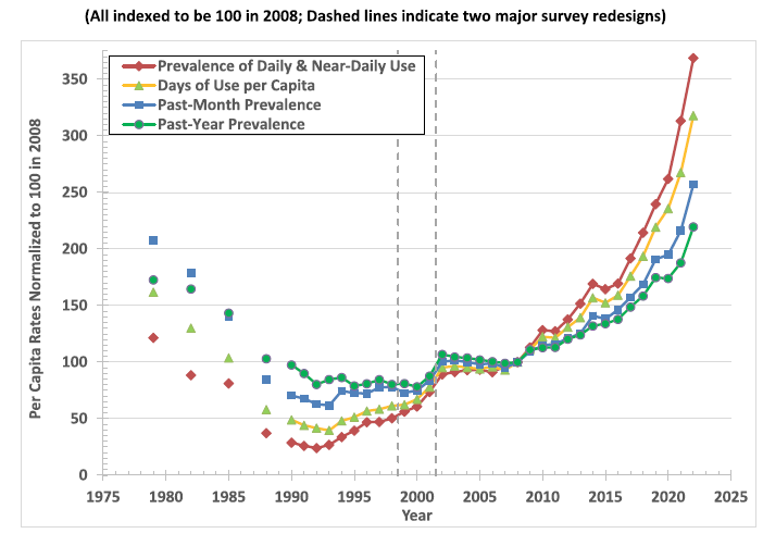 With hindsight, it looks marijuana is considerably more elastic than originally thought. Over a decade after recreational legalization began, surveys consistently show that marijuana use has gone up dramatically. Anecdotally, Americans have begun to notice the same thing. It is normal to smell marijuana smoke in any major city where the drug is legal. The results from a recent study are striking. First, the rate at which people use marijuana has gone up dramatically over the last 25 years: