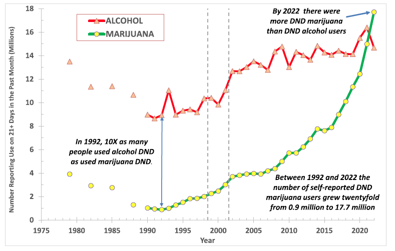 Equally striking is when marijuana is compared to alcohol. In 2005, the ratio was 3:1 in favor of alcohol. For the first time ever, there are now more daily or near-daily users of marijuana: